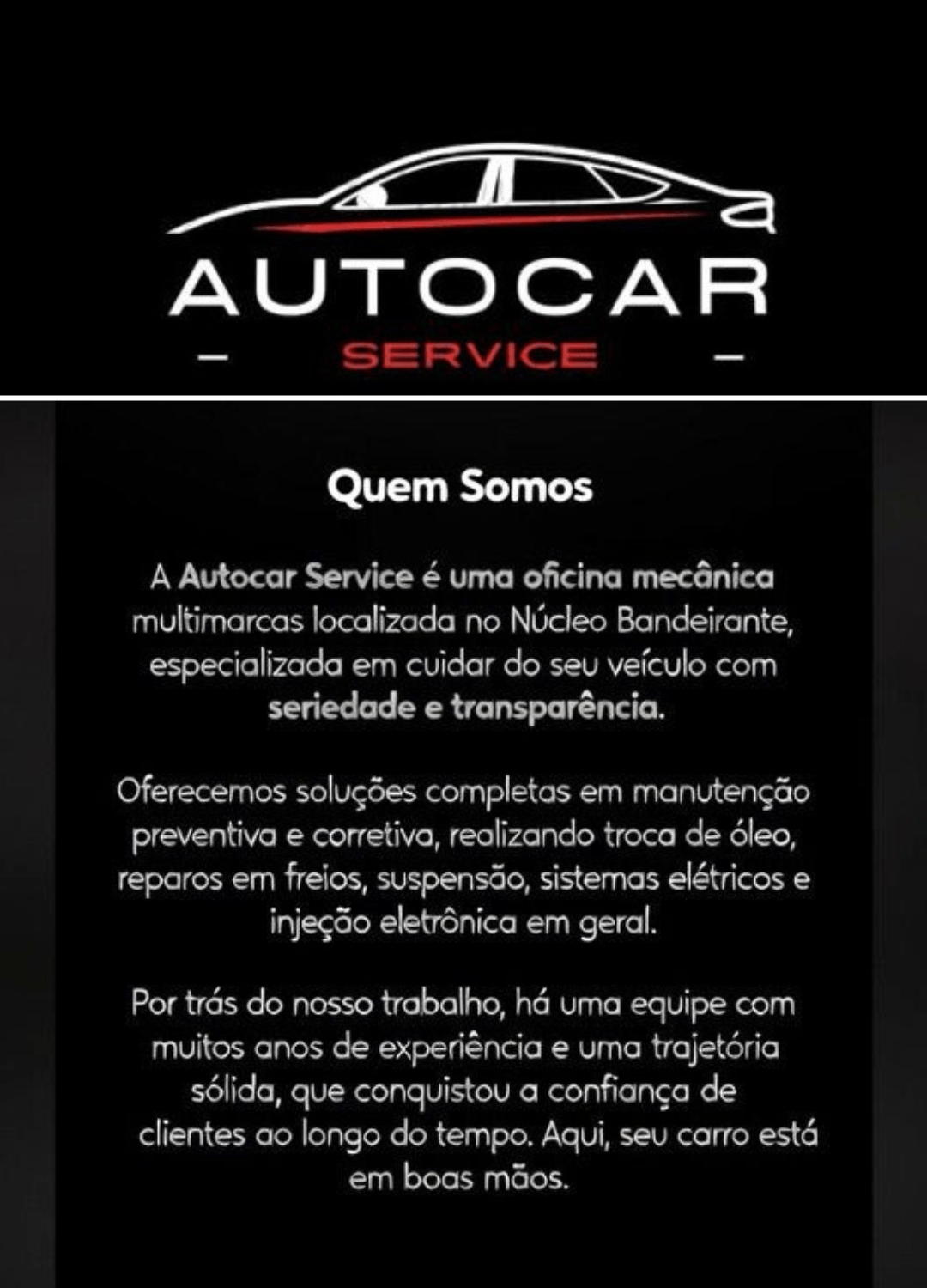A Autocar Service é a sua oficina mecânica de confiança no coração do Núcleo Bandeirante. Localizados no Setor de Oficinas (SOPi, Conjunto D, Lote 2, loja 1), somos especialistas em cuidar do seu veículo com a seriedade e a transparência que ele merece.